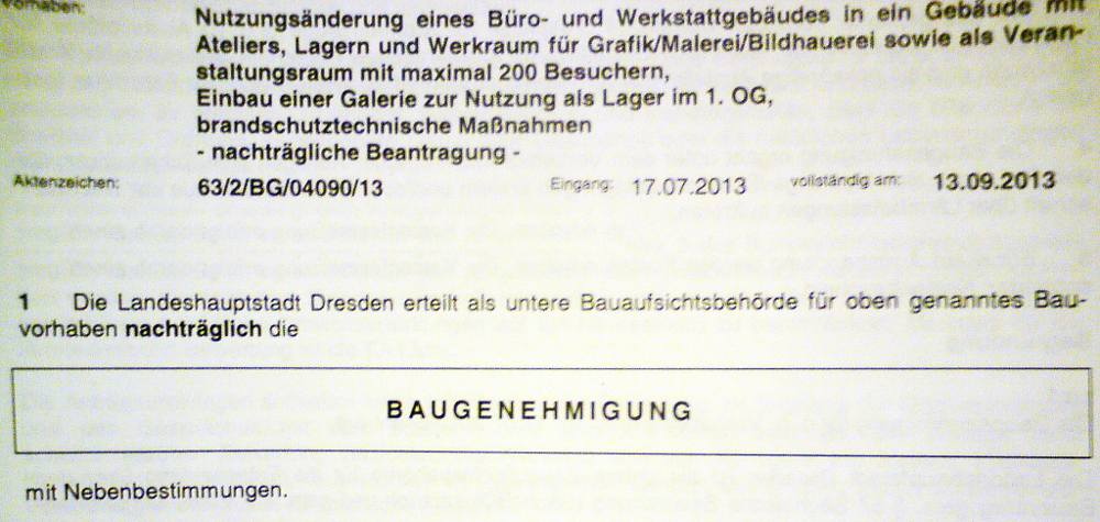 Die im letzten Jahr beantragte Baugenehmigung zur Nutzungsänderung wird uns unter der Voraussetzung einiger Auflagen vom Dresdner Bauaufsichtsamt genehmigt.