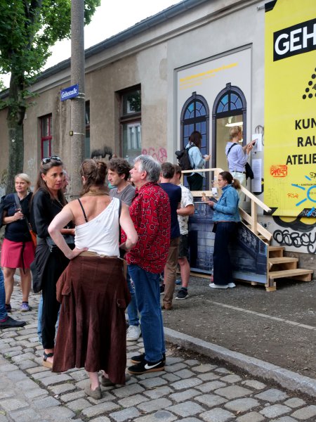 Und 2023, da lernt Das KloHäuschen – bzw. Anja Uhlig/realitaetsbüro, die mit und für den Raum die „Maßnahmen zur Beseelung des Klohäuschens an der Großmarkthalle“ realisiert – zwei Dresdener Künstler kennen, Heinz Schmöller und Lucas Oertel, die gerade Teilnehmer beim Arkadienfestival in Ebersberg bei München sind. Es kommt zu Besuch und Gegenbesuch – und Anja lernt dabei das Projekt GEH8 und den GEH8-WERKRaum kennen. Und so entsteht zusammen mit Heinz Schmöller die Idee, daß das KloHäuschen auch mal nach Dresden reisen könnte – und der GEH8-WERKRaum ist bereit, sich als Feriendomizil zur Verfügung zu stellen.